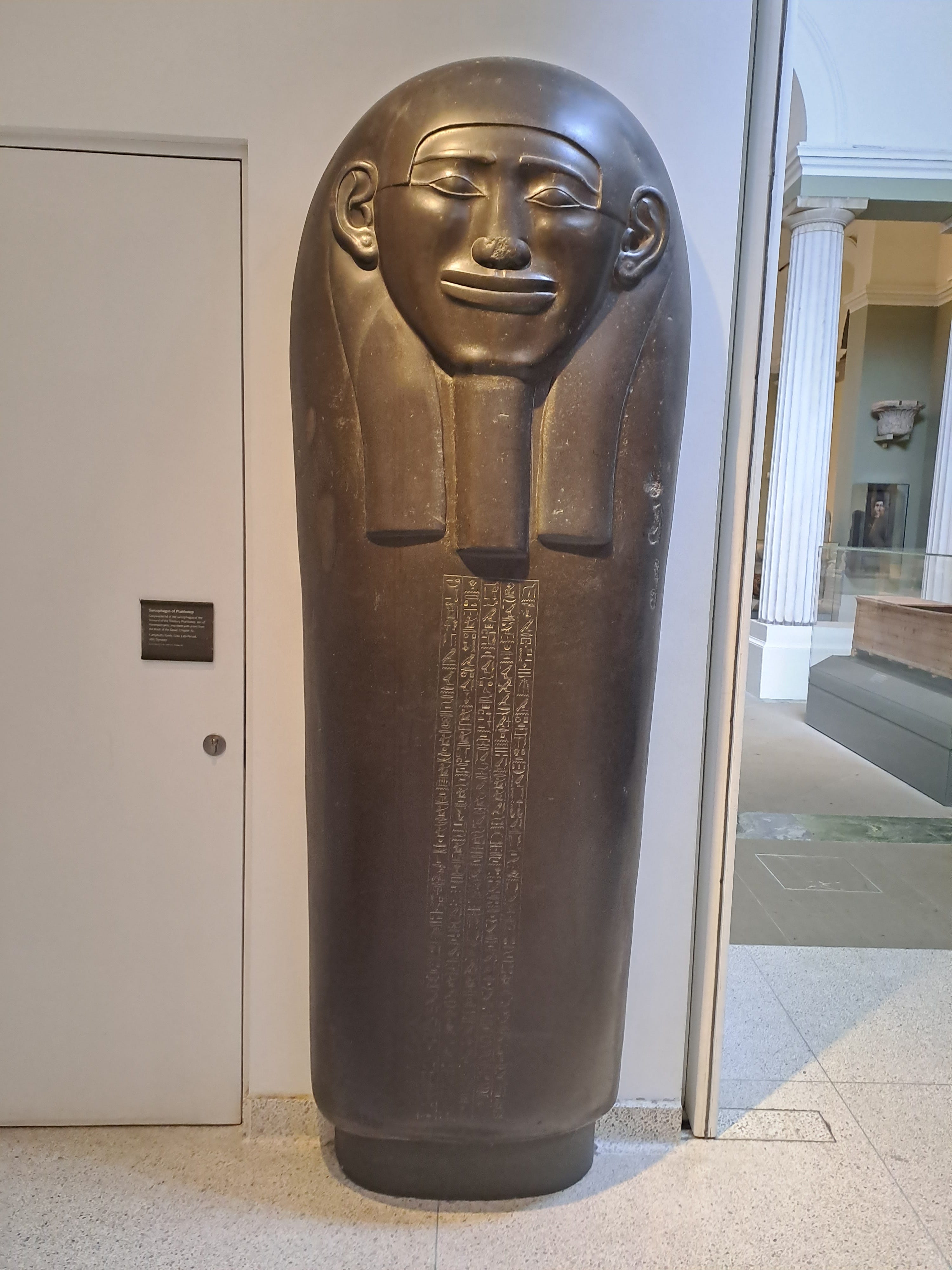 Sarcophagus of Ptahhotep. Greywacke lid of the sarcophagus, inscribed with a text from the Book of the Dead, Chapter 72. Campbell’s tomb, Giza, Late Period, 26th dynasty. The Ashmolean Museum, Oxford.